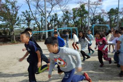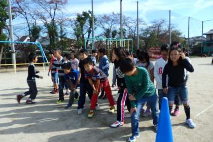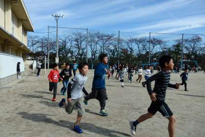 体育委員さんの合図でマラソンが始まります。子どもたちは,何週走ったか記録していくため,とても張り切っています。