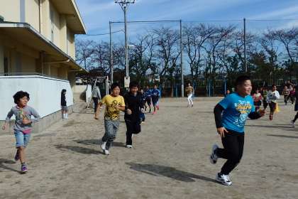 高学年はトラックの外側を,低学年は内側を走ります。他の子に合わせるのではなく,自分のペースを守って,5分間を走り続けられるようにすることが目標です。