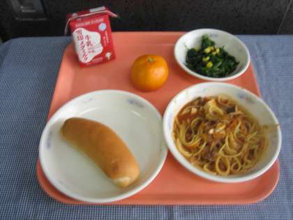 小型コッペパン・牛乳・スパゲティのミートソース煮・ほうれん草のソテー・みかん