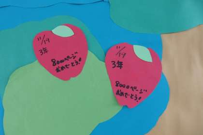 そして,図書館から嬉しいお知らせが!第1号が出てから約3週間,8000ページ達成者第2号が出ました!今回は2人とも3年生です。長い本をたくさん読む高学年向きに……と始めた取組ですが,低学年〜中学年も多くページ数ランキングの上位に入っていて嬉しく思います。次の達成者になりそうなのは6年生。あと500ページ以下に迫ってきています。これからもどんどん達成者を張り出していくので,「次は僕かな?」「次こそ私!」という人も楽しみにしていてください。
