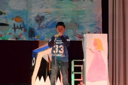 背景やクジラも完成し,今日はそれらをセットして舞台練習を行いました。特にクジラは大迫力で,体育館へ運ぶときに,すれ違う子どもたちから「すご〜い!」と声をかけられるほどです。背景があると,演技にもますます気持ちが入ります。出入りや衣装の付け替えの工夫をいろいろして,今日も充実した舞台練習でした。