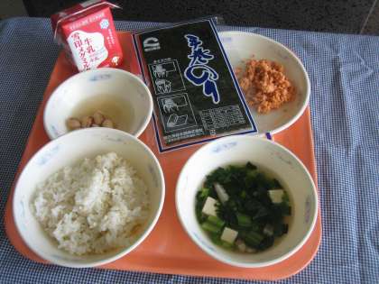 麦ごはん・牛乳・セルフおにぎりの具(うめさけ)・とら豆の甘煮・とうふの吉野汁・手巻のり
