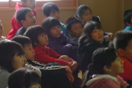 主なテーマは地球温暖化です。この調子で地球の気温が上がり続けると……というスライドショーを見ます。5年後,10年後……と,どんどん高くなっていく気温に子どもたちも釘付けです。100年後には現在との気温差が10度以上になるところも多く,世界地図中が真っ赤に変わります。真っ赤になっている地球を見て「え〜!?」と驚きの声をあげます。