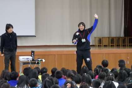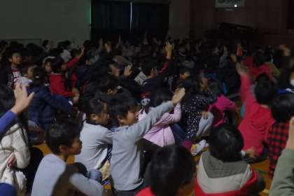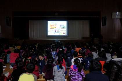 校長先生は,世界の子どもたちについてのお話をされました。始めは世界の人口や子どもたちの人口など……そこから,学校に行けない子どもたちのお話や,様々な文化のお話をされました。クイズでは,みんな手を挙げて盛り上がります。学校に行けない子たちは世界で約2億人。日本の全員の人口よりも多いということには,とても驚いている様子でした。