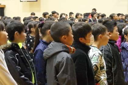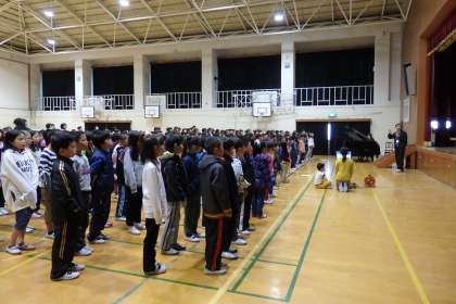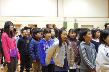 最後は全校合唱です。今日は校長先生が指揮をとってくださりました。今月から歌うのは去年と同じく『ふるさと』です。6年生は別のメロディを歌いながら,全体で掛け合いを楽しみます。初めての合唱でしたが,去年も歌っていたためか,綺麗な歌声で歌うことができました。