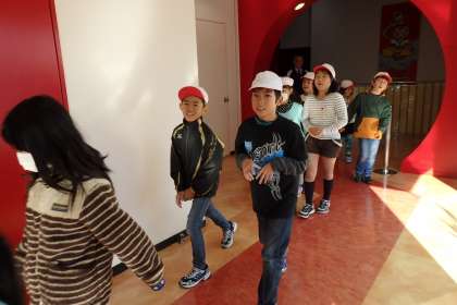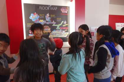 いよいよコーラ工場に到着です!工場の入り口から,とても可愛いポーラーベアやサンタのポスターが子どもたちを出迎えてくれます。キラキラと華やかなエントランスに子どもたちもわくわくした様子です。