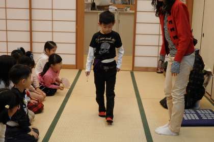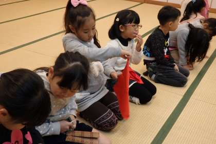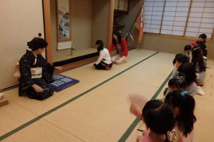 低学年部の子はお座敷入りと袱紗捌きの練習をします。月に一度の茶道教室ですが,少しずつ慣れてきたようで,説明を受けなくても自分一人で最後まで袱紗捌きをできる子が増えてきました。