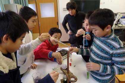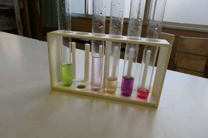 紫色だった紫キャベツの茹で汁は,水溶液を入れることによって,美しく色が変化します。右から2番目が元々の色,一番右が酢を,一番左は石灰水を入れたものです。一瞬の色の変化に子どもたちも驚いた様子でした。
