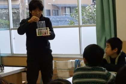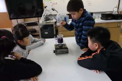 今日はクラブ活動の日です。科学クラブでは,紫キャベツを使った実験を行いました。ビーカーにキャベツをちぎって入れ,ぐつぐつと煮込みます。できた煮汁は,どんなことに使うかというと……?