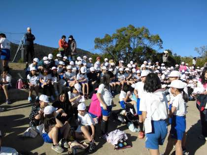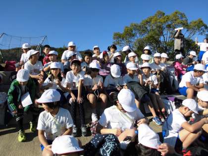 嵐山東公園に到着しました。学年ごとに階段に並び,走る準備をします。もう一度準備体操をしている子もいました。