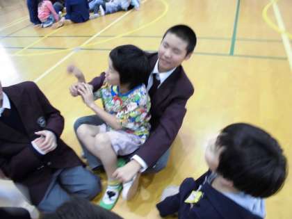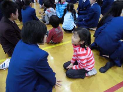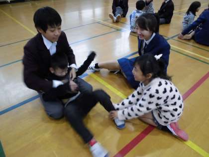 最後には中学生のお兄さん,お姉さんたちともすっかり仲良しに。本当のきょうだいのように中学生に甘える姿も見られました。