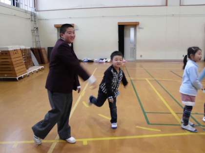 写真はレクリエーションの「猛獣狩り」のようすです。動物の名前の文字数と同じ数の人数でグループをつくる遊びです。グループを作ったら,そのメンバーで自己紹介です!