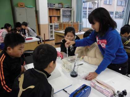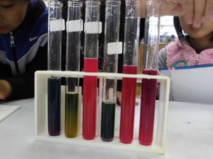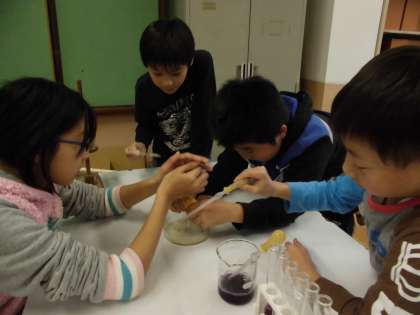 先週は酢と石灰水を行いましたが,今日は子どもたちが持ってきたものに加え,アンモニア水,水酸化ナトリウムなどでも実験をしました。色の変化はとってもきれいで,みんなでワイワイと楽しみました。
