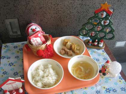 「なまぶしと厚あげの煮つけ」は「なまぶし」はふっくらと煮ました。その煮汁で「厚あげ」をコトコト煮込んでしっかり煮含めました。ごはんがとてもススム献立でした。