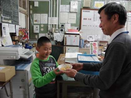 4組の畑で作った大根を使って調理実習をしたそうです。自分たちで育てた大根なので,料理をする時にも気合が入ったのではないでしょうか。実習の後,作った大根の煮つけを職員室まで持ってきてくれました。