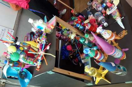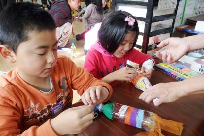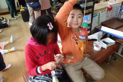 今回の合同作品のテーマは『宇宙』です。傘を使った土台の上に,みんなが作ってきたロケットや宇宙人などを飾ります。2人も自分達で作ったロケットにタコ糸を付けて,ぶら下げて飾ることができるようにしました。タコ糸結びも,自分たちで行いましたよ!