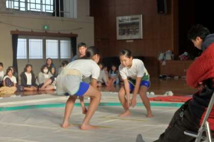 女の子の準決勝には,5年生2人,6年生が2人残りました。しっかり組み合って一歩も引かない名勝負でした。土俵際ギリギリまで勝負が決まらなかったのですが,最後の最後で足が土俵から出て,5年生の優勝となりました。