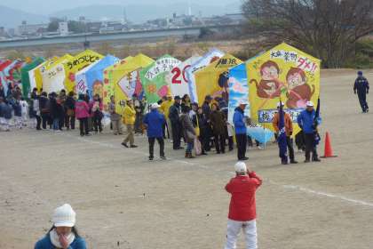 穏やかな天気に恵まれ,桂川河川敷で全梅津大凧揚げ大会が開催されました。子ども凧揚げと表彰式の後,各種団体作成の大凧の力作が並びました。梅津北小学校児童会の大凧も2回目もチャレンジで大空高く挙がりました。少年補導の皆様方,ありがとうございました。