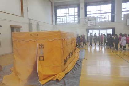 次は「けむり体験」です。煙の充満したテントの中を通り,視界の悪さなどを体感します。