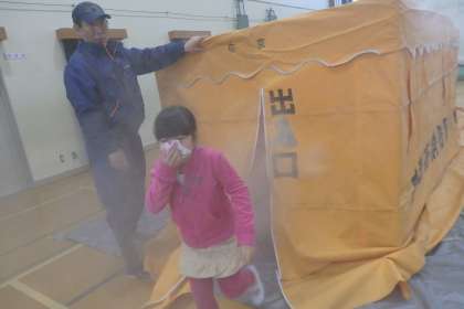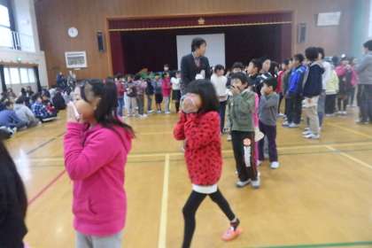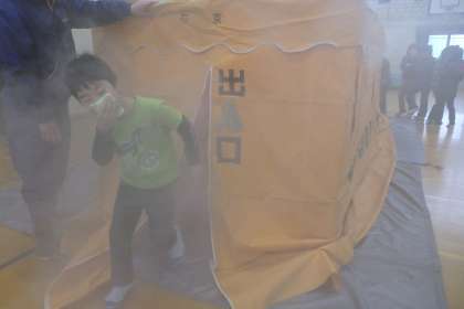 3年生のようすです。出入りが増えてきたため,体育館にもテントの煙が広がっていきます。