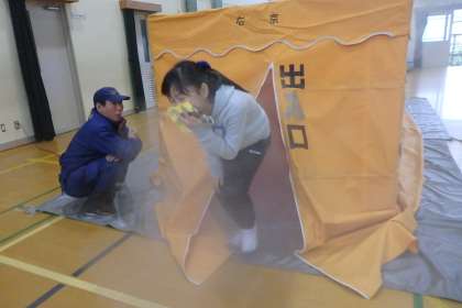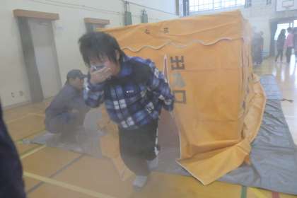 最後にトンネルを通るのは6年生です。今回の「けむり体験」では火事が起こったときの煙のようすを体験しました。実際の火事が起こった時のけむりは黒く,さらに視界が悪くなります。そして,有害なガスが含まれているため,それを吸い込んでしまい,体が動かなくなり逃げ遅れる……ということが,とても多いそうです。