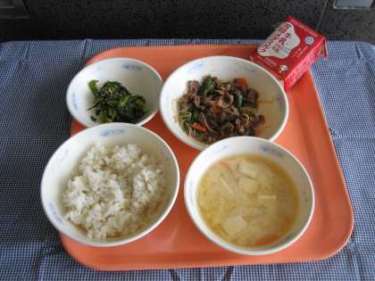 麦ごはん・牛乳・牛肉のしぐれ煮・小松菜のごま煮・高野豆腐のみそ汁