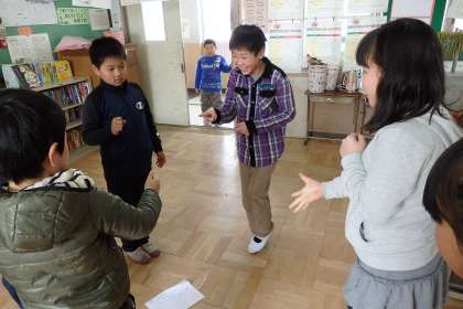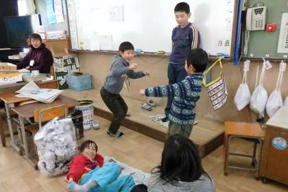 昼ごろにはしんしん降っていた雪が雨に変わったため,外遊びが割り当てだったグループは部屋の中で過ごしました。部屋遊びのおなじみ,新聞乗りやカードゲームを楽しみました。
