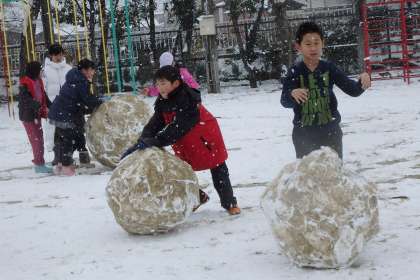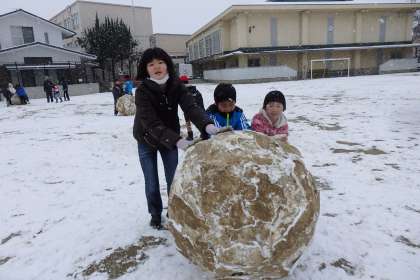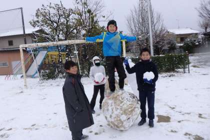 大きな雪玉を転がすのは4年生。「1年生からもらったの。」と,ずっしり重たい雪玉を引き受けて更に大きく転がします。蹴ったり押したり,3人がかりで体当たり。先生や管理用務員さんも加わって,みんなで大きな雪玉を作りました!