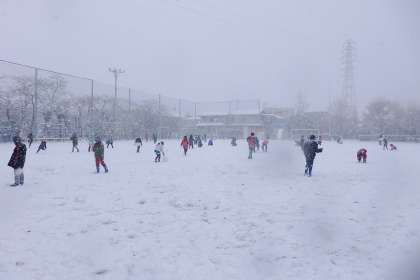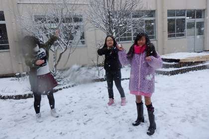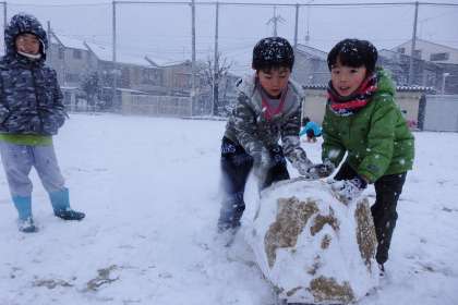 いつの間にか運動場は子どもたちでいっぱい!作り始めた雪玉も,とっても大きくなりました。高学年の子どもたちも元気いっぱいではしゃいでいます。