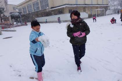 「1番のり〜!」と,1年生の女の子たち。まだ誰も足跡を付けていない運動場は,真っ白な銀世界。とても綺麗です。