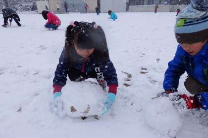 はやる気持ちで運動場にやってきた子どもたちは,地面に積もった雪をかき集めて,雪だるま作りを始めます。