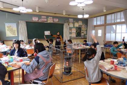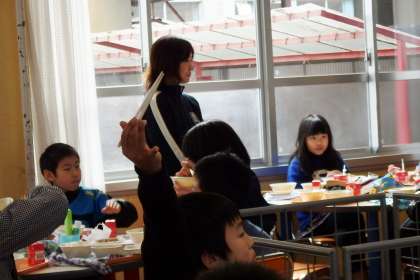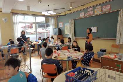 4年生2組は今週ランチルームで給食を食べています。今日は木曜日なので,栄養教諭さんと給食調理員さんが来てお話をしてくださいました。