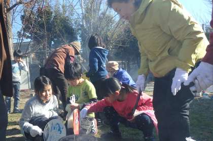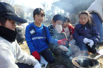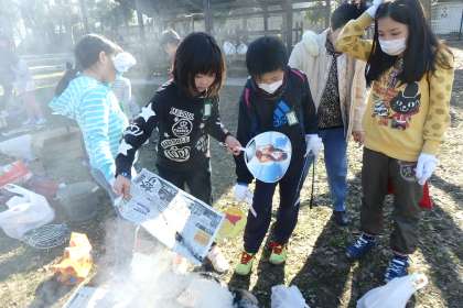 どんどん火に勢いがついてきて,煙が立ち込めます。団扇で空気を送りながら「煙たい!」「目が痛い!」と大騒ぎ。昔は火をおこすのにも一苦労だったんですね。