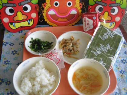 ごはん・牛乳・手巻ずし(具)・だいこん葉のいためもの・キャベツの吉野汁・いり豆・手巻のり