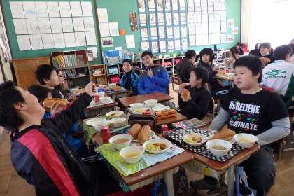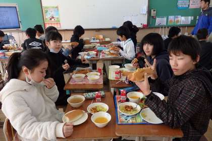 先生も一緒に写ってもらいました。みんなでわいわい給食。とても楽しそうです。