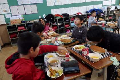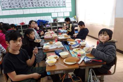 1組は4組さんとの交流給食でした。美味しそうに食べています。