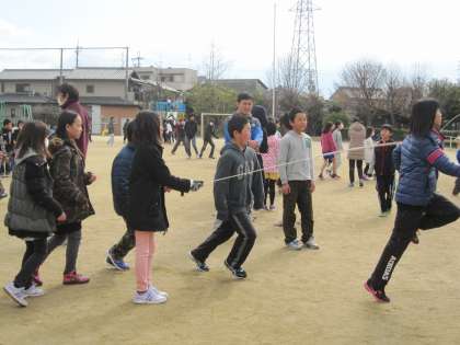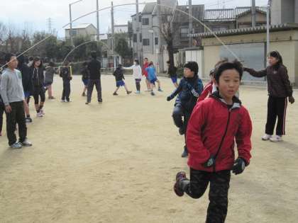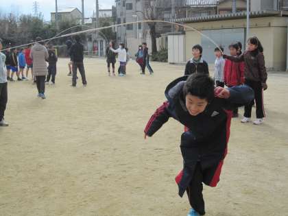 休み時間に練習をつんできた5年生。縄の中を駆け抜けます!