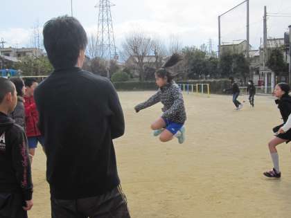 1組は先生の掛け声に合わせて。間をあけて,時間の節約です。どんどん跳んでいきます。