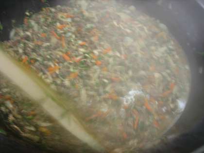 「プルコギ」は下味をつけた牛肉を炒めた中に人参・玉ねぎ・にら・まいたけを一緒に炒めて味付けをして仕上げました。
