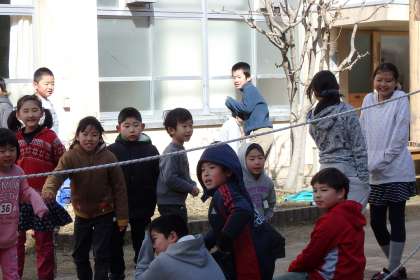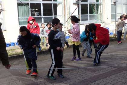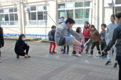 いつも人気の大縄跳びですが,今回は低いところをくぐったり,高いところを跳びこえたりする遊びで盛り上がっていました。決めたところが高すぎたり,低すぎたりして「こんなん無理や〜!」と笑いあったり,リンボーダンスのようにくぐりぬけたりと,楽しそうでした。
