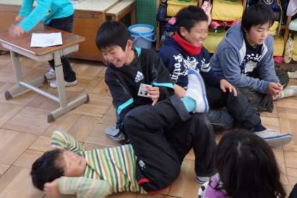 まずは部屋遊びのようすから。今年度始めに人気だった新聞乗りやトランプに加えて,椅子取りゲームやだるまさんが転んだなど,新しい遊びを行うグループも増えてきました。学年を越えて,ふざけ合ったり笑いあったりしています。