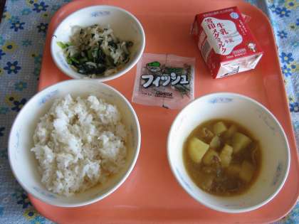 麦ごはん・牛乳・肉じゃが(カレー味)・小松菜と切干大根の煮びたし・じゃこ