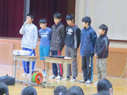 全国大会の2日前のなかよし集会で,壮行会でもらった横断幕を披露し,選手が決意を述べました。