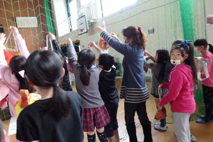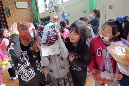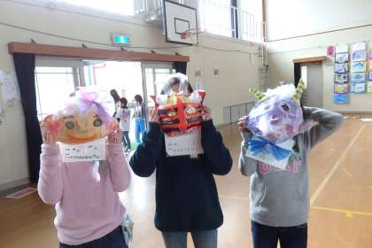 3年生はお面の作品です。今年は動物を模したデザインが多くあります。モールを使ってりぼんを作ったり,ひげを付けたりと工夫しています。