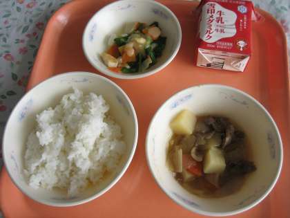 ごはん・牛乳・牛肉と野菜の煮つけ・てっぱい