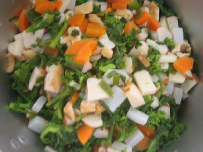 今日の給食では、かまぼこ・油揚げ・青ねぎ・人参・こんにゃくと京野菜の花菜を煮たものに、教室で手作りの「酢みそ」をかけていただきました。とても色鮮やかで「春」を感じられました。