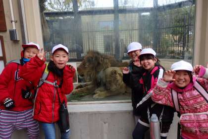 ゴリラの近くには,手足の大きさが比べられるところがあったり,大きなライオンもガラス一枚を隔てたすぐそこに!「ガオー」と口をあけるライオンのそばで,はいチーズ!子どもたちは大はしゃぎです。