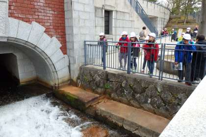 また,記念館の外には,水車の模型などの展示があったり,今まで見てきた水の流れが川のように流れていくところが見られます。子どもたちは勢いよく飛び出る水に驚いている様子でした。