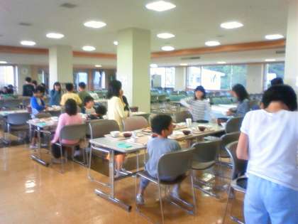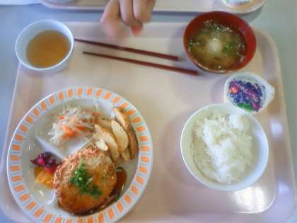 今日の夕食風景 鶏肉ハンバーグと野菜炒め。みんな満足した顔をしていました。