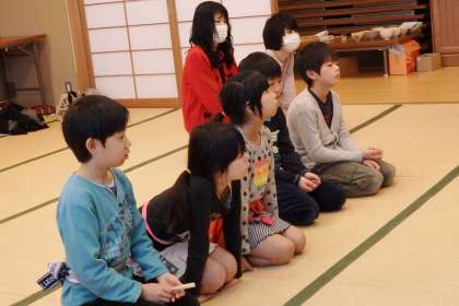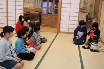 今回で6年生は最後の茶道教室となります。今まで習ってきた成果を,みんなで拝見!先生に教えていただきながら,お手前を披露します。他の学年の子たちも,背筋をピンの伸ばして見守ります。